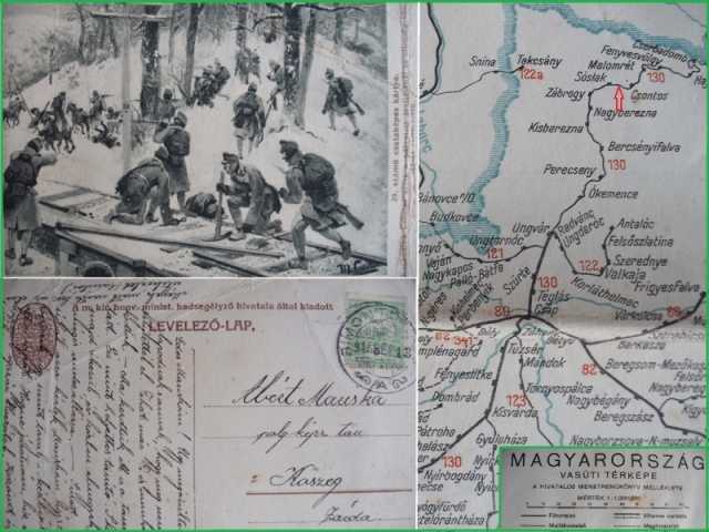 Engedjétek meg, hogy a háborús és a vasúttal kapcsolatos téma iránt érdeklődők számára egy érdekes képet és térképet mutassak. Az 1915. szept. 13-án feladott, fénykép részletességű, sokszorosított alkotás a magyar honvédek hősiességét volt hivatott hirdetni. A kép magáért beszél: ”Katonáink Csontos alatt a pályatest javításánál az ellenség támadását visszaverik.” A honfoglalástól napjainkig a fenti területre igazán illik a „hadak útja” elnevezés. Az első bécsi döntés után a visszatért Kárpátalja vasútvonalai is megtalálhatók a MÁV által kiadott vasúti térképen. Ezen a II. világháború időszakában készült térképen jelöltem az I. világháborús csatakép helyszínét.