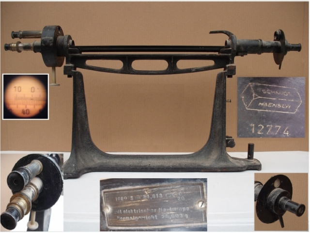 Segítséget kérnék ennek a 850 mm hosszú, 420 mm magas és 14 kg súlyú, német feliratú szerkezet meghatározásához. Az öntöttvas vázra épített műszeren a baloldali alsó lencsét zseblámpával megvilágítva a nézőkében egy álló és alatta egy körbe forgatható skála látható. Kérdezném az optikákat ismerő T. Tagtársakat, hogy mikori lehet a műszer és mire használhatták. A válaszokat előre is megköszönöm.