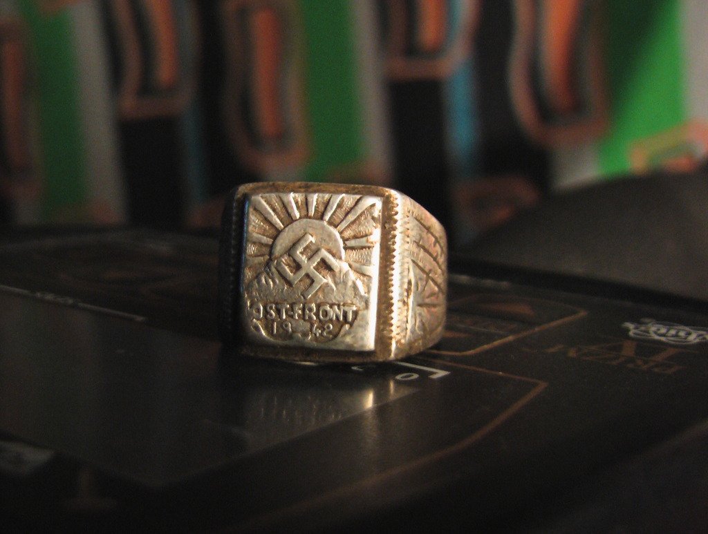 Nem vagyok a téma szakértője, de tanultam annyit itt az Oldalon, hogy a Harmadik Birodalom jelképei, jelvényei a leggondosabb vésnöki munkával, igényes kivitelben készültek. Ez a gyűrű cseppet sem tűnik ilyennek. (Nem csak a szélekre gondolok (ami lehet kopás), hanem pl. a kereszt kialakítására vagy a szöveg középre helyezésére, a betűk-számok "bukdácsolására"...)