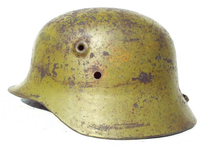 Szóba kerültek már a préselt szellőzővel készült magyar rohamsisakok, épp ideje volt készíteni néhány képet egy ilyenről. Természetesen a címben szereplő "40M" típus pusztán teoretikus utalás a német M40 sisak jellemzőire de az analógia adja magát. Egyenlőre konkrét magyarázat nem ismert eme ritka variáció létrejöttét illetően. A képen látható sisak 64-es méretű, formailag és a málhafül szegecselése alapján is MÁVAG jellegzetességeket mutat. A szellőzők a sisak saját anyagából préseltek ellentétben a 35M modellnél megszokott megoldással. Érdekes módon gyártójel nem látható benne, az egyetlen jelzés a hátul elhelyezett 0 . Eredeti tábori zöld szín ami különösen kívül maradt ép.