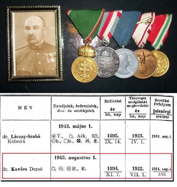 A képen Dr Kovács Dezső orvos őrnagy(később ezredes, csendőrorvos) A budapesti 1. csendőrkerület orvosfőnöke látható, kitüntetéseivel, az 1944. évi rangsorolás szerint, Később (ezredesként) a kitüntetés sora kiegészült: http://postimg.cc/image/rui8p45vn/ (Bár így sem tartozott a legjobban dekorált törzstisztek körébe). Esetleg ha valakinek lenne képe, története a bemutatott személyről, megköszönném. Köszönöm Ajtony a képet.Üdv:K.