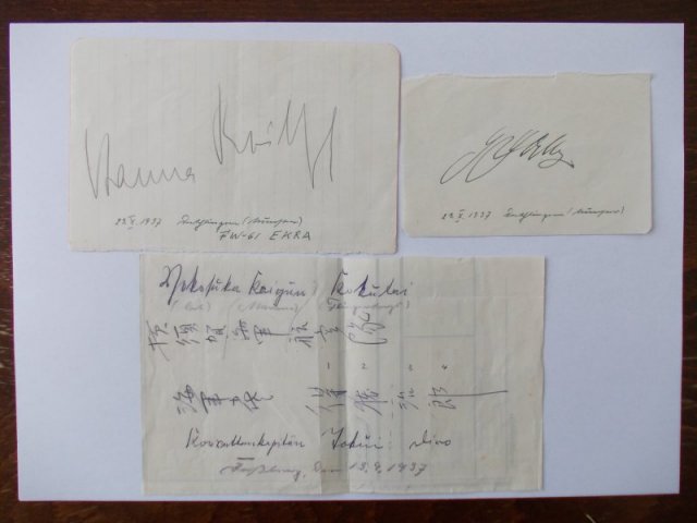 A közelmúltban vásároltam az alábbi aláírásokat. Hanna Reitsch pilótanő aláírása mellett számomra ismeretlen, valószínűleg repüléshez köthető német személy autogramja. Mindkettő 1937. október 23-án íródott, a helységnevet nem tudtam megfejteni. A japán aláírásból a következőket sikerült megfejteni: Yokosuka Kaigun Kokutai (Császári Japán Haditengerészeti Légierő egyik egysége)Korvettenkapitan. A név talán Jokui .... Talán akad köztetek valaki, aki tudja pótolni ezen hiányosságokat. Hozzászólásaitokat előre is köszönöm.