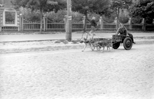 Egy érdekes képre bukkantam. Láttam már kereső kutyákat, őrkutyákat, sőt robbanó kutyákat is tankok ellen, de ilyen eddig még nem találtam sehol. Vajon gyakran használtak kutyákat szállítási célokra? Kíváncsi lennék az indokokra, hogy miért nem motorral, vagy autóval szállítottak, hiszen a kép készültekor 1942 nyarán szükségből biztosan nem alkalmazták őket.