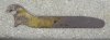 Hétvégi keresőzésünk "soványka" eredménye. Előkerülés: Bakony, Herend környéke, erdei lelet. Egy betemetett lövészárok szélében volt. Érdekessége, hogy német állások voltak ott, magyarról nem tudok. Csak otthon vettem észre, hogy mintha egy cseppet zöld festék folt lenne rajta. Oxálsav hiányban, gyorsan vettem a boltban egy fagyasztott sóskakrémet és beáztattam. Elég szépen előjött a festék. Nekem teljesen libazöld festésnek tűnik. A szemem "guvasztottam" de semmilyen beütőt nem találok rajta. A lyuk pont a súlypont közepén van. Elég nagy darab. Hossza 20,5 cm. Lemezvastagság 2 mm. Kik, mikor, mire használták? Ha tudtok róla infót, ne fogjátok vissza magatokat.