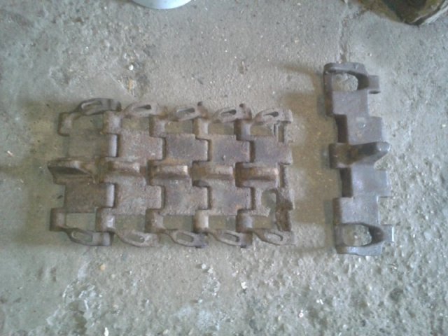 A T-54 szemen kívül van egy kis érdekesség. Az 5 db szem véleményem szerint Panzer III. Panzer IV. vagy stug III.-é lehetett, 44-45 közötti modósított osketten futóműhöz valók. Ez már a szélesebb(40cm) széles változat, a 45" szögben elhelyezett kapaszkodóbordák is erre utalnak. Az egyik szemen sérülés látható, közelebbről nézve olvadásnak tűnik. Véleményem szerint mivel sem a csapszegeknél sem a kapaszkodókörmöknél semmilyen használatból eredő kopás nem látható rajtuk, illetve közelebbről nézve még szürke festés is látható a szemeken, tartalék szemek lehettek a tank páncélzatára erősítve. Talán egy páncéltörő lövedék találata után vesztette el a szemeket.