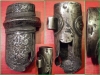Kacatos ládából mentettem meg ezt a sajnos sérült, ezüstből készült 65 mm hosszú, 32 mm belső nyílású gazdagon díszített tárgyat. A minták némelyikében zománcberakás található. Feltételezem, hogy valamikor kard vagy tőr hüvelyének részét képezte. Kérdezem a T. Hozzáértőket, hogy milyen szúró – vágó fegyver tartozéka lehetett a tárgy. A válaszokat előre is megköszönöm.
