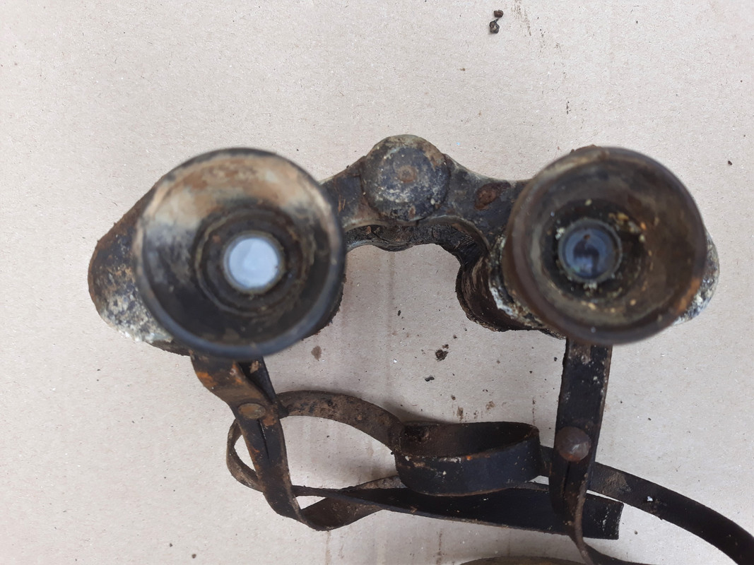 Friss lelet a német bakelittokos (Zeiss?) távcső amely egy régi kútból annak tisztításakor az iszapból került elő. A sáros víz kiöntését követően az első tisztítás után kiderült, hogy a bakelit távcsőtok a fémrészek és a szíjazat az oxigénmentes környezetnek köszönhetően nagyon jó állapotban megmaradtak, száradás után további konzerválásuk következik. A kútban eltöltött hosszú idő sajnos a távcsövet megviselte, de így tokkal együtt ritka, autentikus darab. A képek a tisztítás előtt készültek.