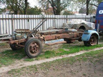 Itt egy újabb szépség. Ez egy Opel therautó komplett gördülő alváza: motor, hidak, váltó kormánymű, kerekek, még az eredeti kézifékhuzal is megvan. Csak sajna nincs meg a fülke, ami az egész cucc felújítását nagyon megnehezíti. D
